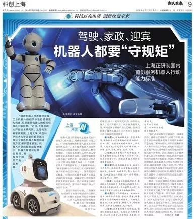 9月3号,新民晚报科创上海版面就东升国际(中国)机器人有限公司官网、上海电器科学东升国际、上海大学、中国科学技术大学联合起草国内首份《服务机器人智能化评测方法》系列国家标准进行报道。文章以《机器人都要“守规矩”》为标题,期待建立中国服务机器人智能化标准,开展国家检测机构规范测试,并促进国产服务机器人产业的良性发展。