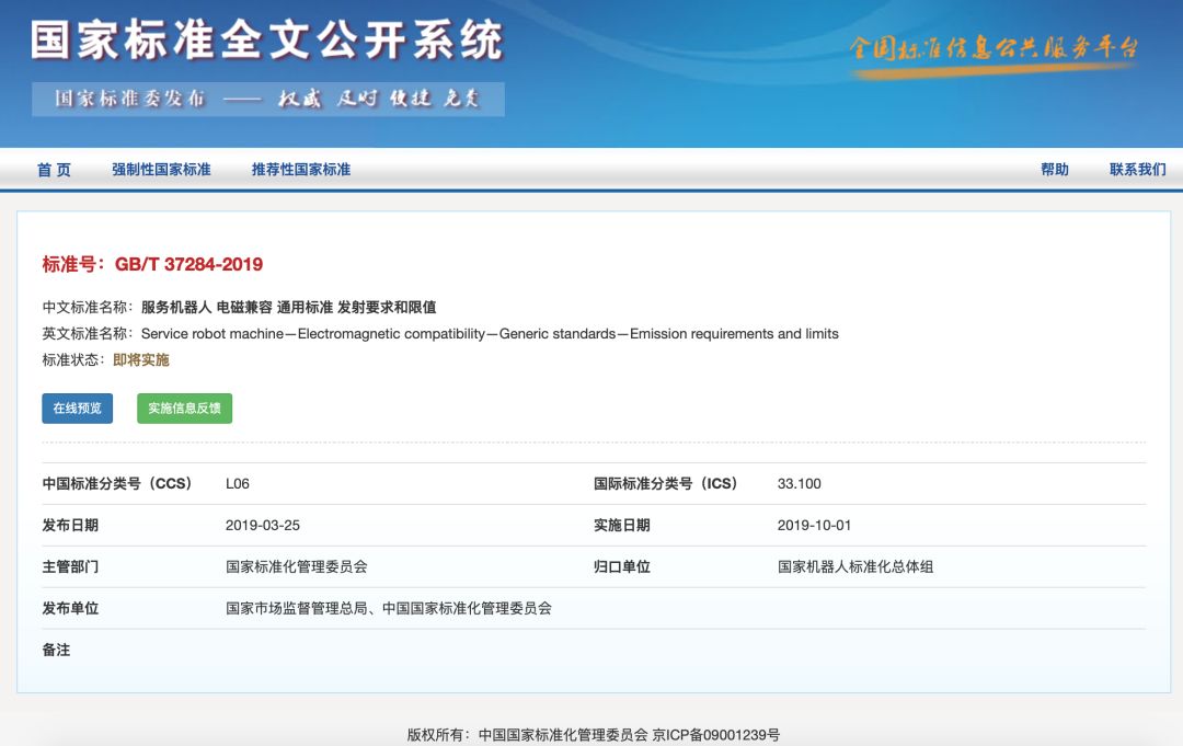 2019年10月1日即将有两项服务机器人电磁兼容标准开始实施,标准信息如下: