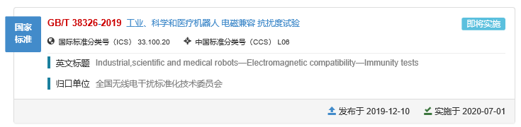 ——GB/T 38326-2019 工业、科学和医疗机器人 电磁兼容 抗扰度试验;