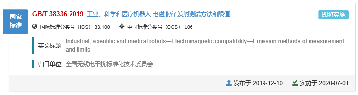 ——GB/T 38336-2019 工业、科学和医疗机器人 电磁兼容 发射测试方法和限值。